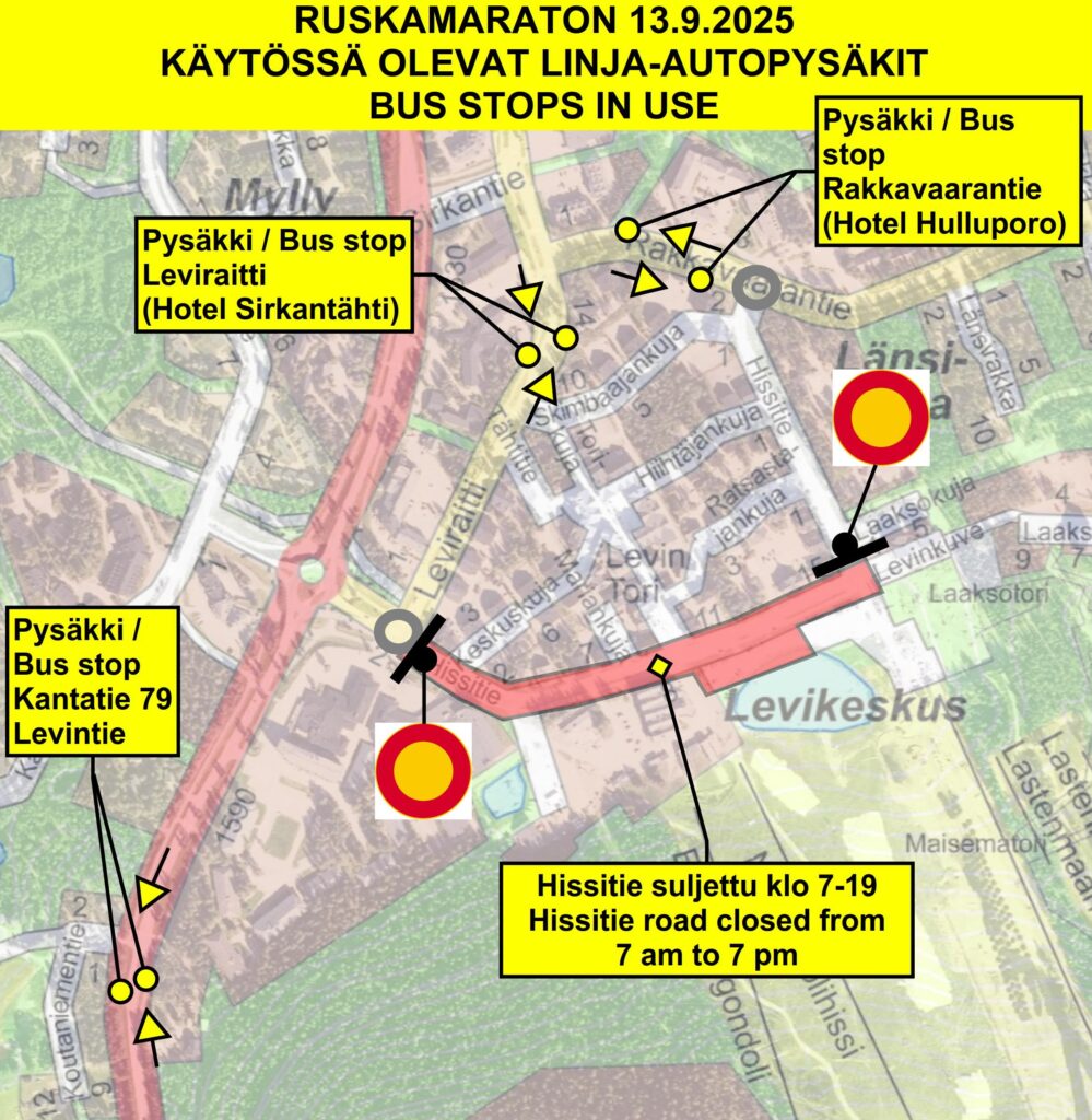 Tapahtuman aikainen Hissitien sulkeminen aiheuttaa muutoksia myös bussiliikenteeseen. Suosittelemme käyttämään ao. kuvan mukaisia bussipysäkkejä.